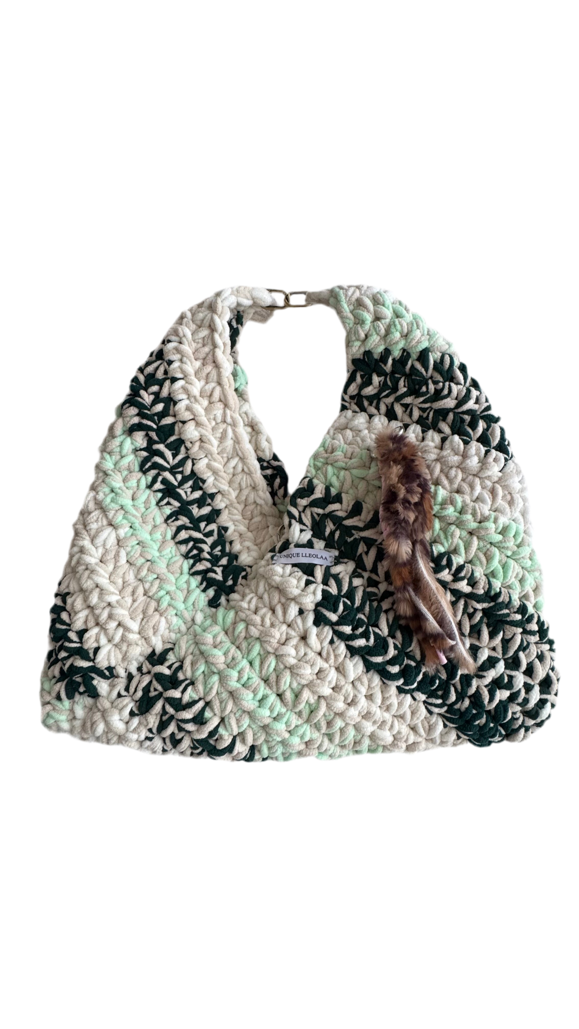 Die Tasche besitzt eine markante, strukturierte Flechtoptik und ist mit einem dekorativen Anhänger aus geflochtenem Garn und Kunstfell versehen, der ihr einen individuellen Touch verleiht. Ein kleiner, stabiler Karabiner-Verschluss an der Oberseite sorgt für sicheren Halt.